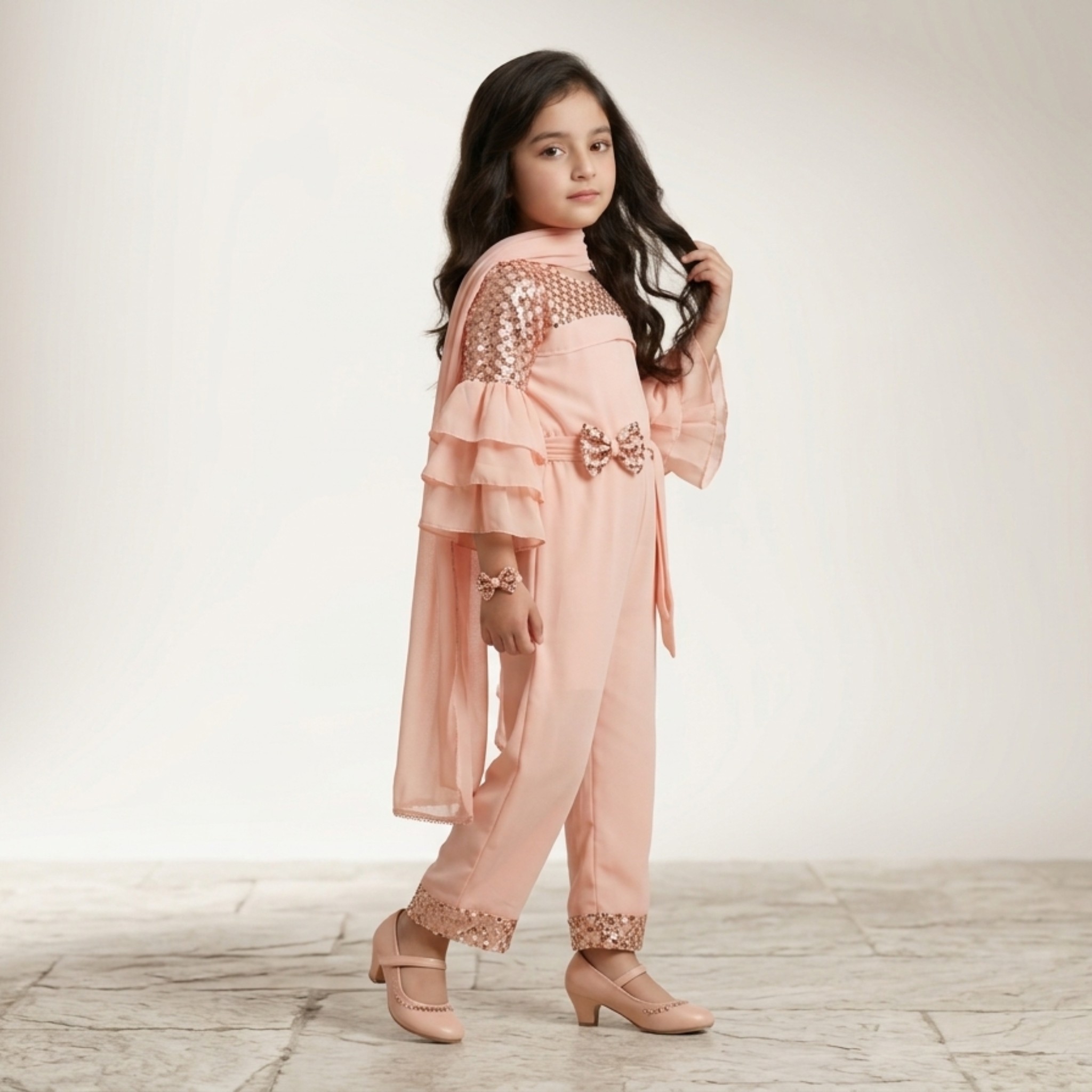 Let your little one shine in style with the Damsel Kids Chiffon Fancy Sequin Jumpsuit. Designed in a soft peach tone, this outfit blends elegance with modern fashion, making it perfect for special occasions.