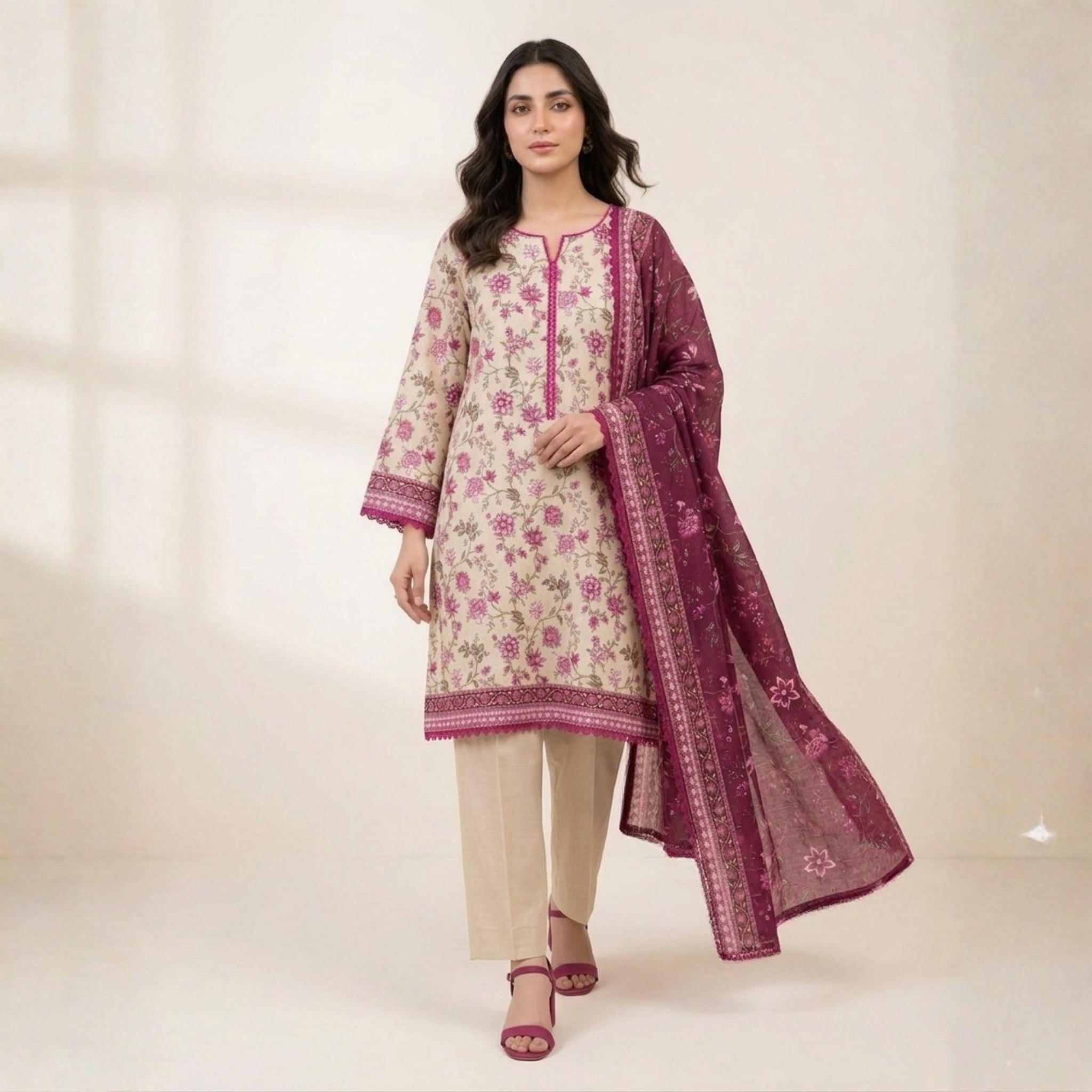 The shirt features a clean, straight silhouette enhanced with subtle detailing and a beautifully printed pattern, making it suitable for both casual wear and semi-formal daytime gatherings. Paired with a comfortable matching trouser and a lightweight lawn dupatta in a rich contrasting tone, this outfit creates a perfectly balanced and polished look.